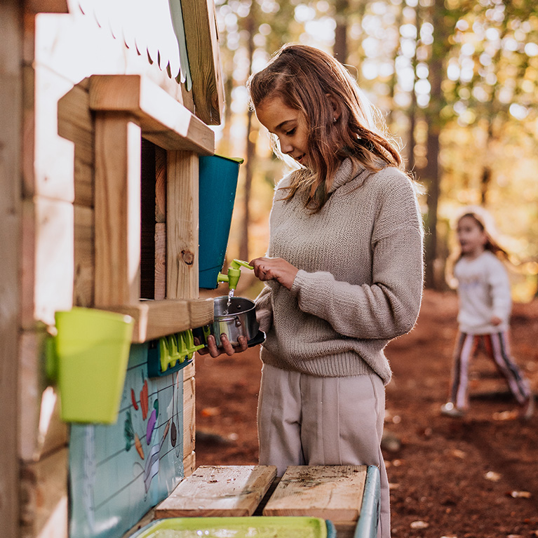 Samla naturliga material som löv, kastanjer, kottar eller frön. De passar perfekt som ingredienser och dekoration. Uppmuntra barnen att hitta på sina egna “höstrecept” – som lövsmörgåsar eller kottkakor – och komplettera leken med örter eller blommor för en extra sensorisk upplevelse. En fast station som fatmoose Splash Station lerkök är ett fantastiskt komplement till lekställningen.